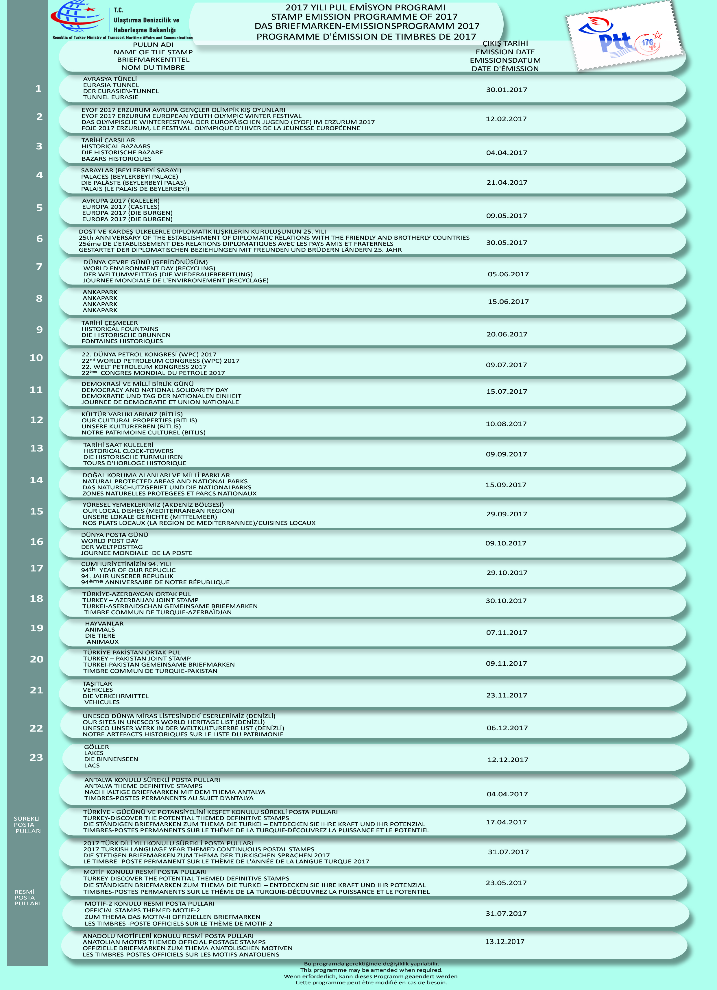 They are prepared annually. Inselection of subjects to be included in the programme, assorted proposals andrecommendations received from Ministries, Presidency of the General Staff, Universities, Foundations and Associations, Public sector, anniversaries ofimportant events determined by our section and various subjects are evaluatedby a commission so created and given its final shape. Stamp issuing program inits final shape after approval by the related Ministry on behalf of theRepublic of Türkiye is notified to philatelists within Türkiye and abroad andpostal offices.