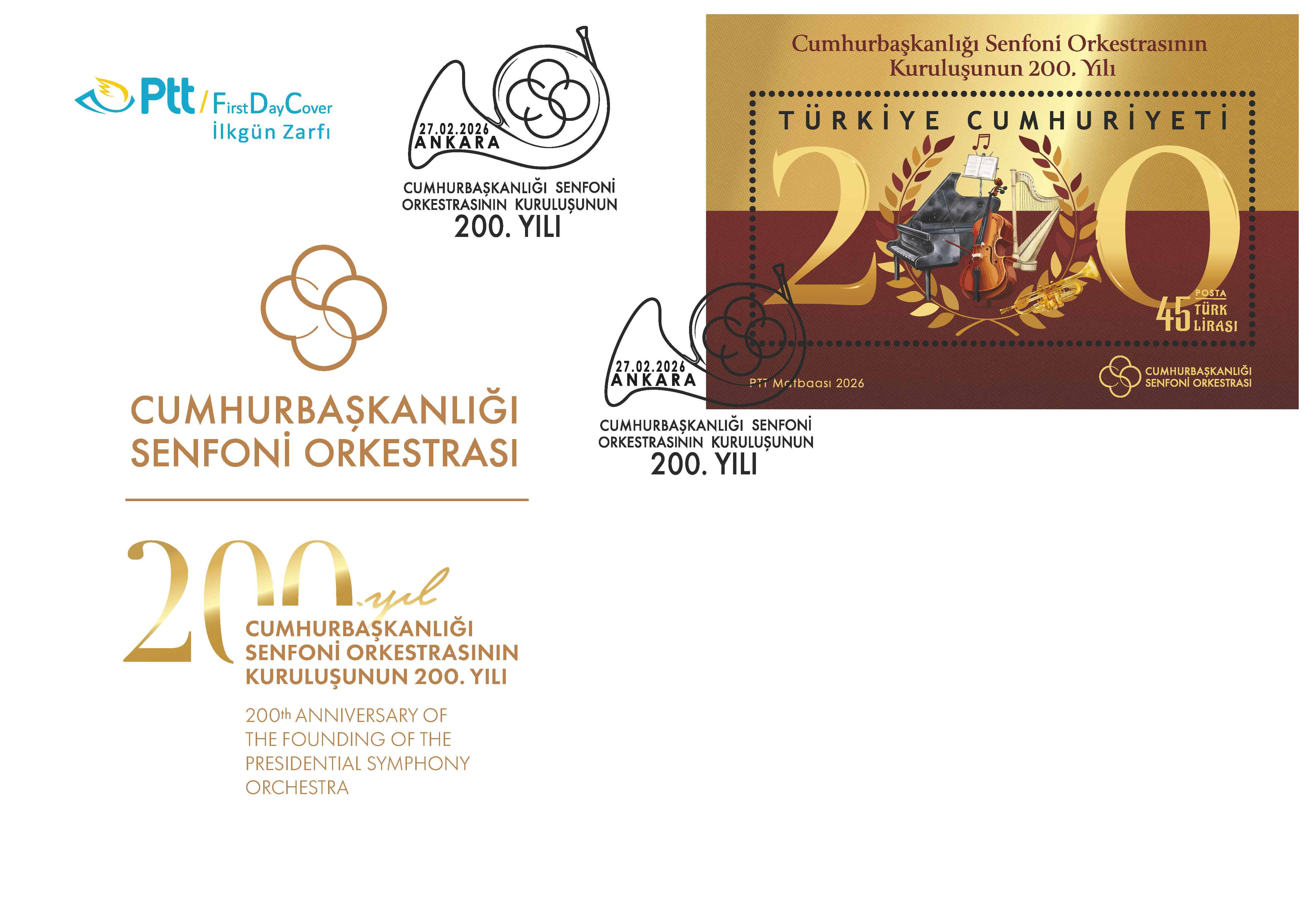 PTT AŞ tarafından “Cumhurbaşkanlığı Senfoni Orkestrasının Kuruluşunun 200.Yılı” konulu anma pulu ve ilkgün zarfı 27 Şubat 2026 tarihinde tedavüle sunuldu.
