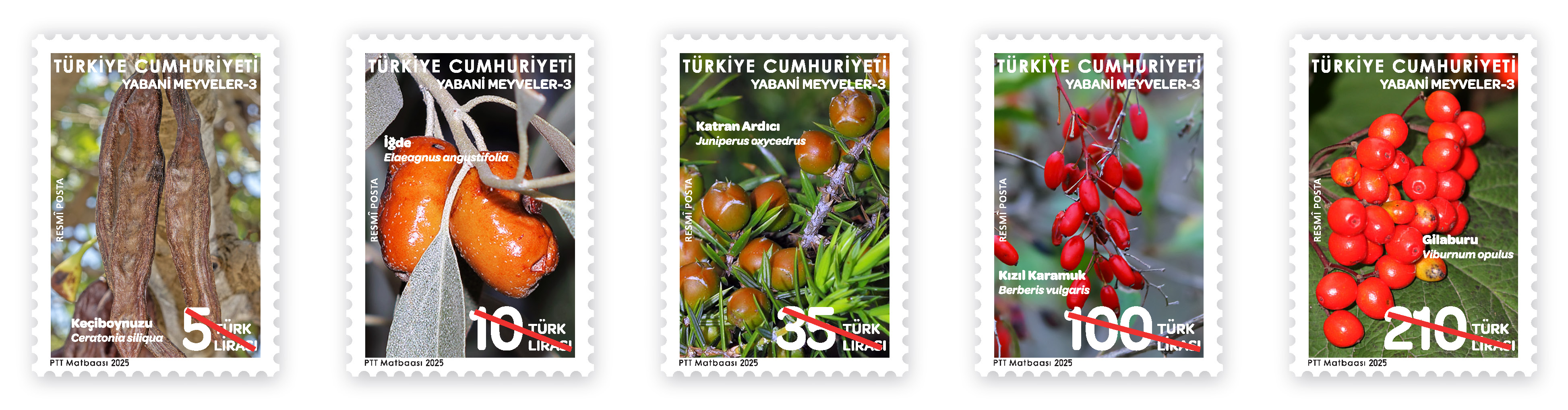 PTT AŞ, 11 Ağustos 2025 tarihinde “Yabani Meyveler-3” konulu (26x36 mm boyutunda) 5 TL, 10 TL, 35 TL, 100 TL ve 210 TL bedelli resmi posta pullarını PTT iş yerlerinde, PTT AŞ’ye ait www.filateli.gov.tr web adresinde satışa sundu.